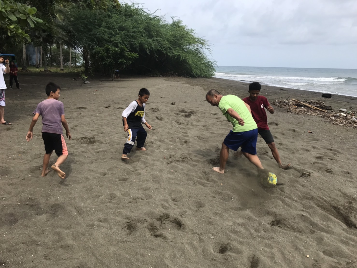 ビーチではサッカーの得意な小森先生が子どもたち相手に大人げなく…と思ったら、足場の悪い砂浜とペコペコのサッカーボール、極めつけは無限の体力を持つ子どもたちに逆にボコボコにされかけました。笑