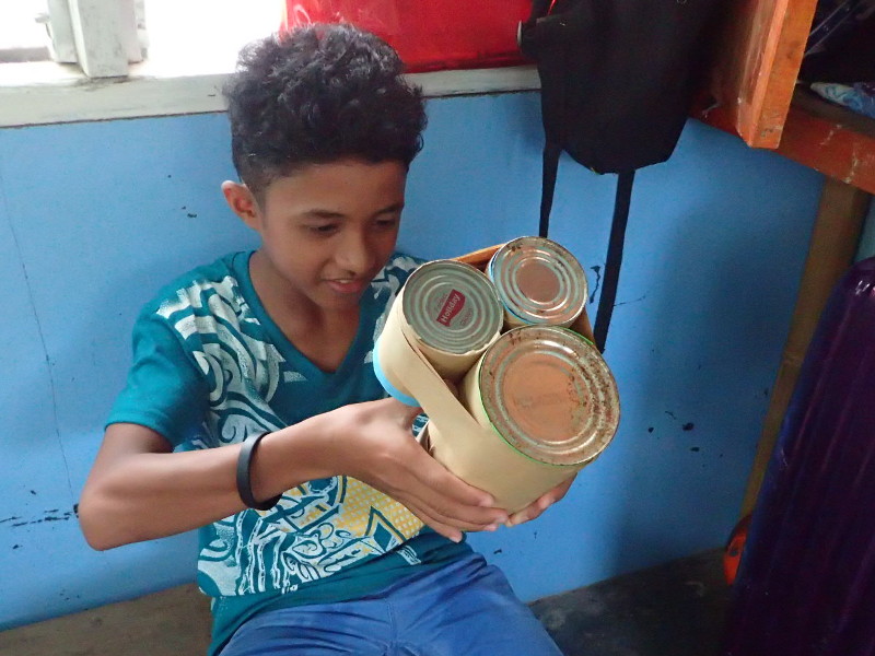 ジェイエムは学校の宿題だ、ということで、空き缶を集めてドラムを作っています。