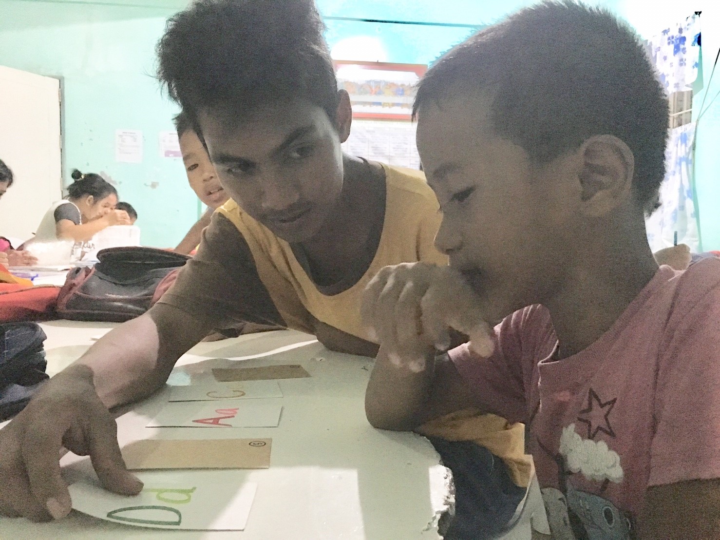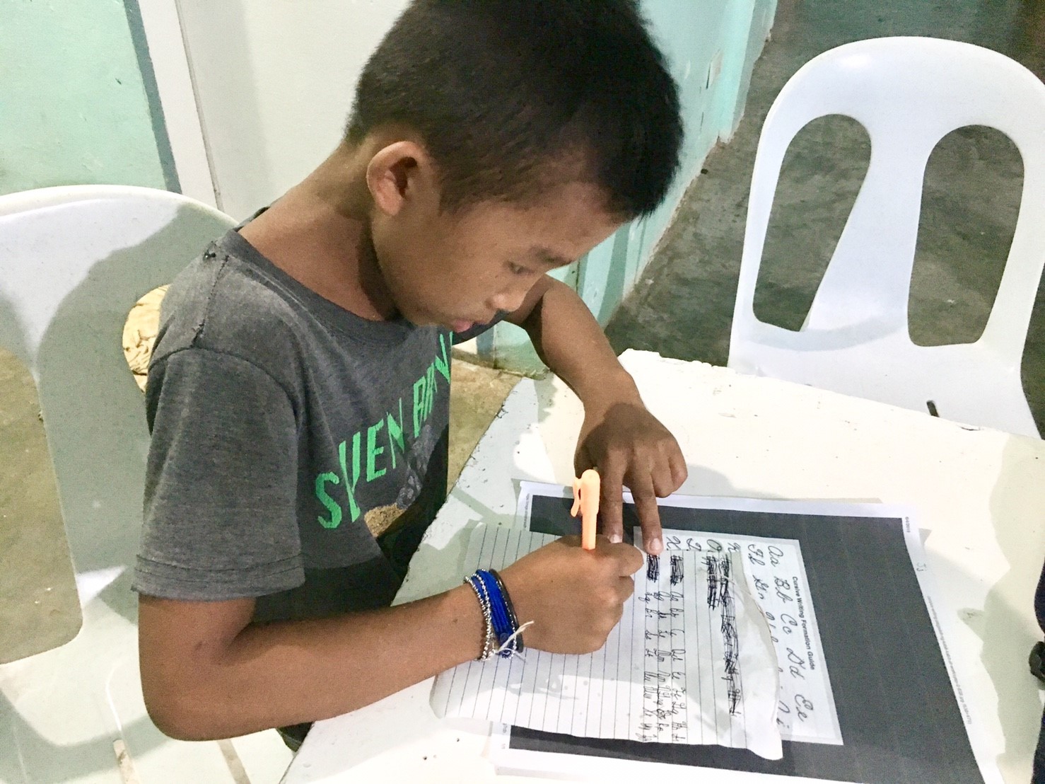 アルジェは、最近新しく作られたフラッシュカードでアルファベットのA~Eまでの練習です。ビサイヤ語の母音の関係で、こっちの人たちは普段AとEを区別しないんですよ。なので、アルジェもその二つの発音の違いに苦戦していました。ジェイプリルいわく、Aは柔らかい発音でEは硬い発音なんだとか。そう教えると、アルジェもだんだんわかってきたみたいで、すごく楽しんでいましたよ!この「できる!わかる!」という感覚が勉強を続けるうえでとても大事なので、しばらくはゆっくりじっくりと「できる」感覚を持たせながら教えていこうと思います。