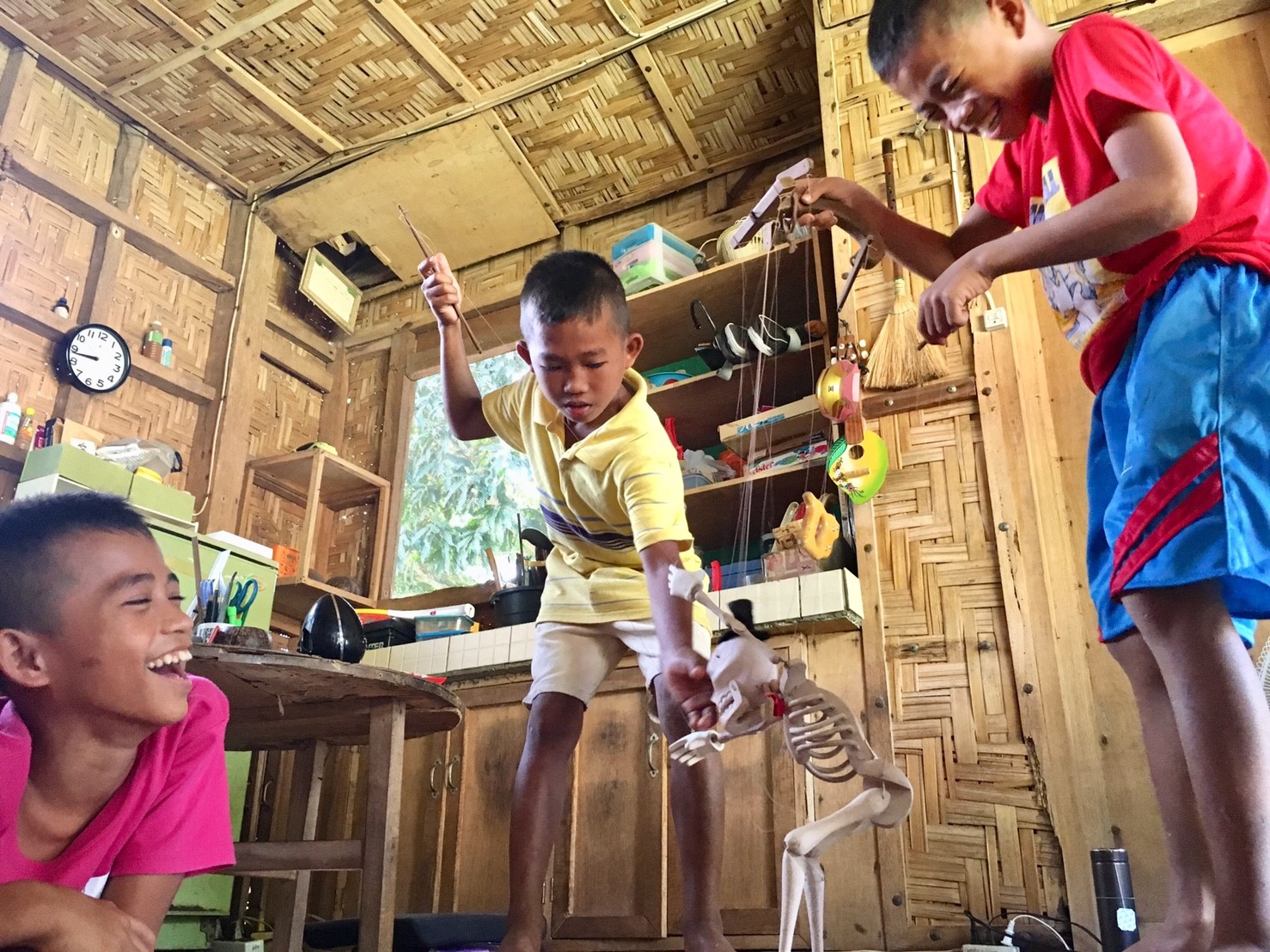 最後はしんさんのガイコツ操り人形でみんなで楽しみました。これ、見た目通りものすごく複雑で難しいのですが、二人で協力して遊ぶとガイコツが思わぬ動きをして、それがまた面白おかしくてたまらないんですよね(笑)最後はガイコツの動きに合わせてみんなでダンスをして締めくくりました。明日もたくさん遊ぼう!