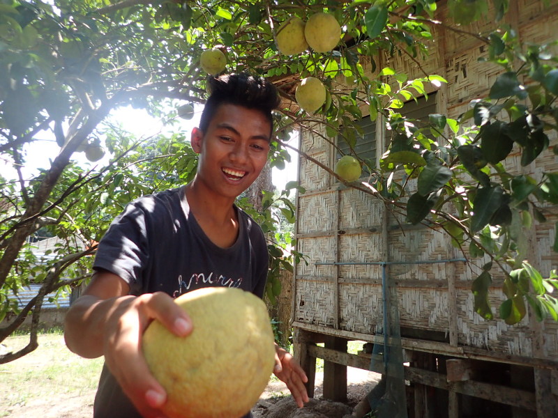見かねてジェプリルが敷地内になっていた美味しそうなポメロの実をとってあげてました。
