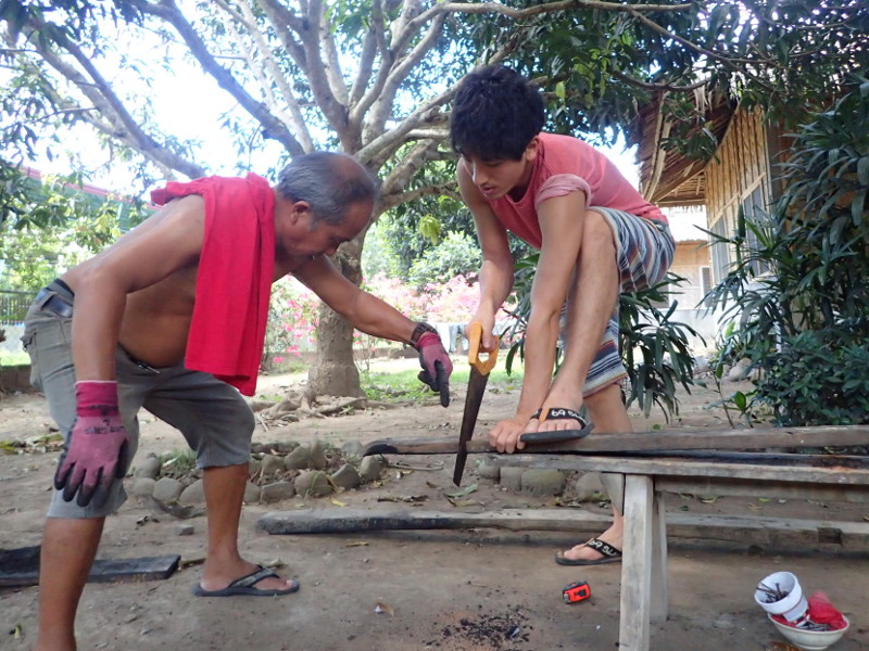 ケイジュもフィデルさんに弟子入りしてノコギリと金槌の修行です。