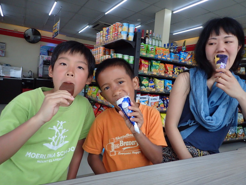 帰りは恒例のセブンイレブンでアイスクリーム。アルジェとタクヨウ君はすっかり仲良しです。