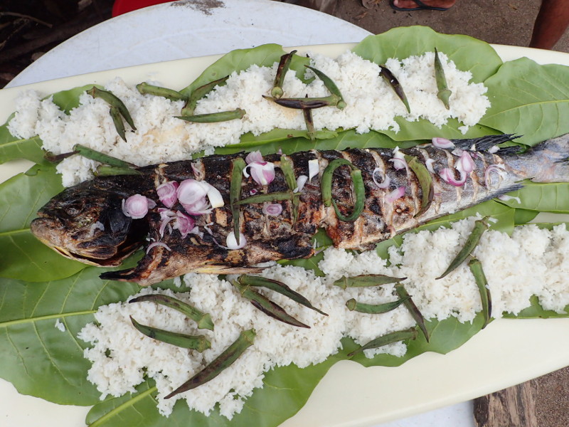 ダヒカンといえば、サーフボードに乗せた焼き魚を手づかみで食べるこの食事!