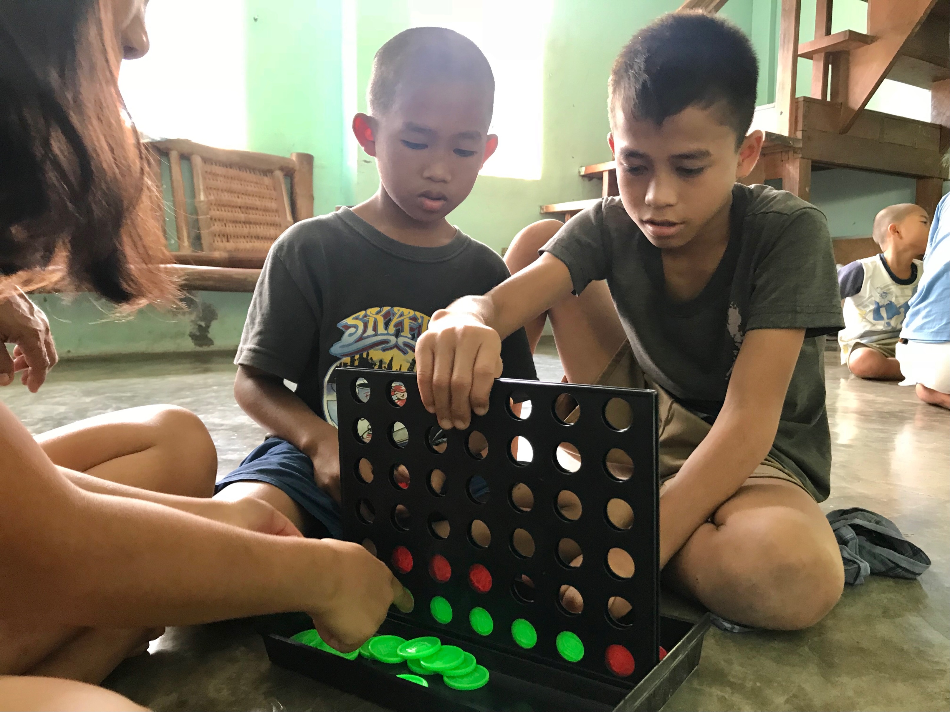 この、簡単だけど、気が抜けないボードゲーム。色のついたコインのようなものを上から落としていき、縦・横・斜めに揃えるゲームです。緑チームがもう揃って勝っているのに、なんでゲームが終わったか理解できていないマイケルとフェルナン。うん、、がんばろう!(笑)