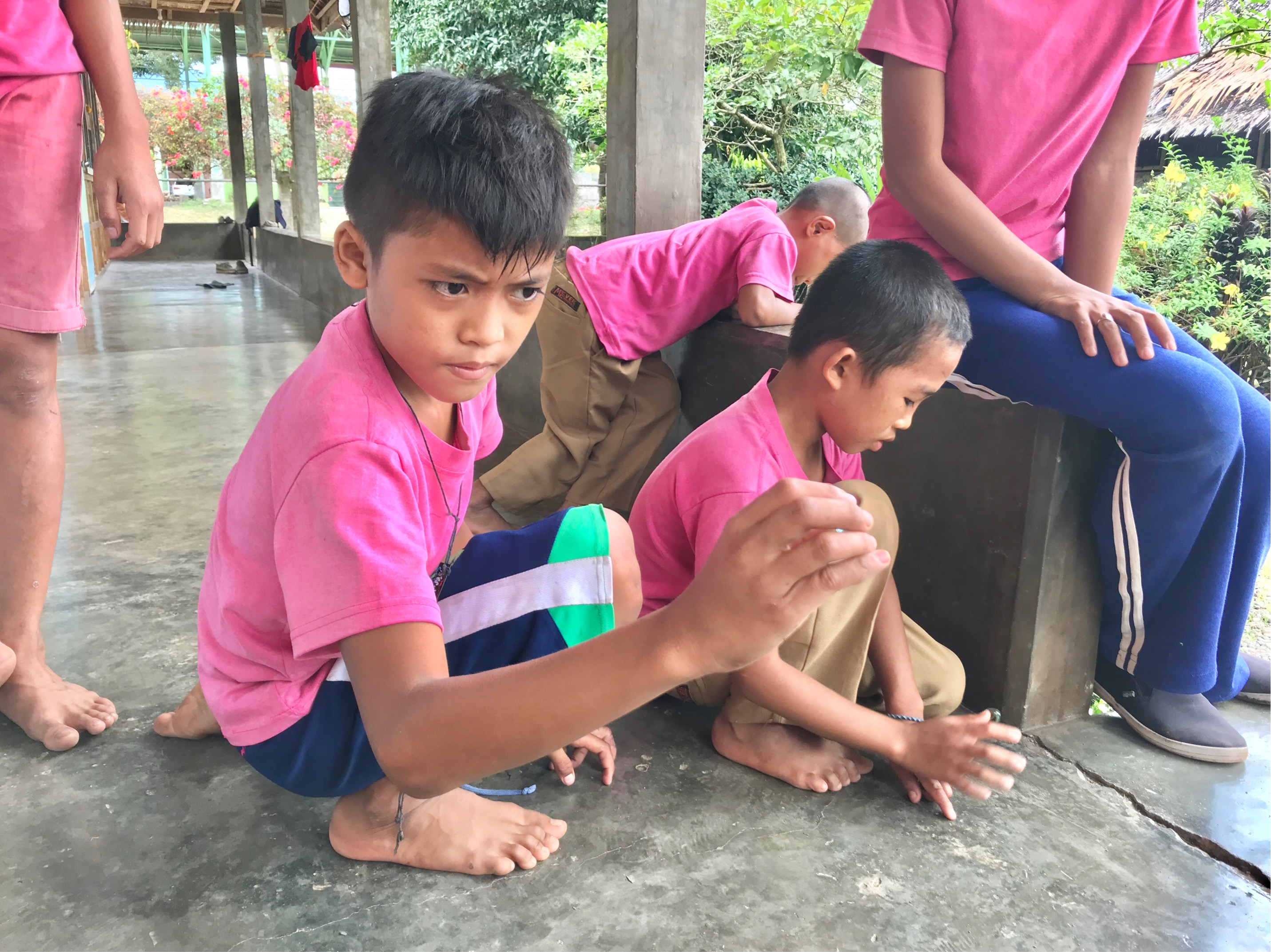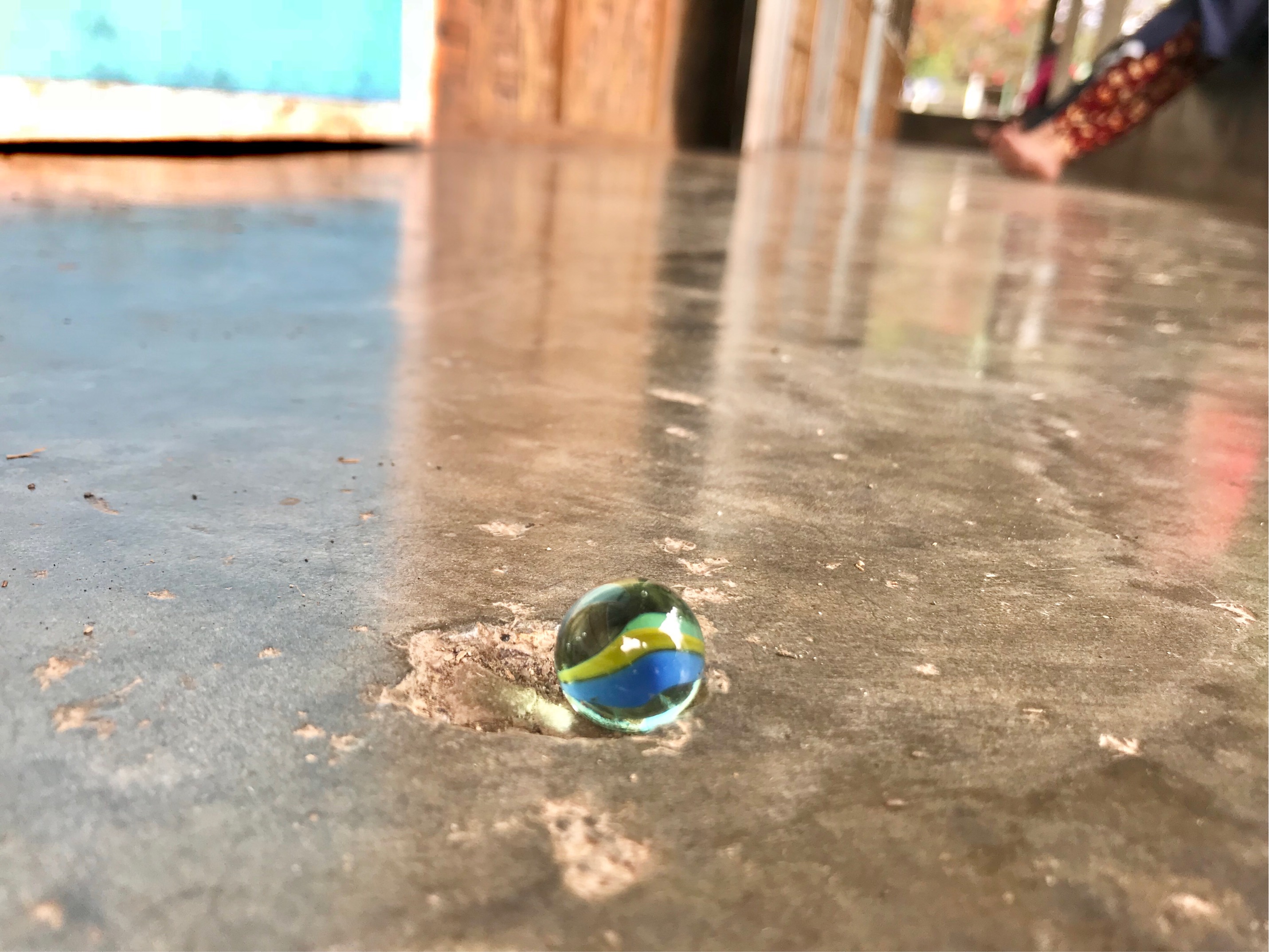 これ、欠けてしまった床の穴を利用して、ビー玉が転がらないようにセッティングし、それにビー玉を投げて当てて遊ぶ遊びです。より投げた回数が少なくて、当たった人の勝ちです。次々と遊びを開発していく子どもたち。遊びの天才だー!