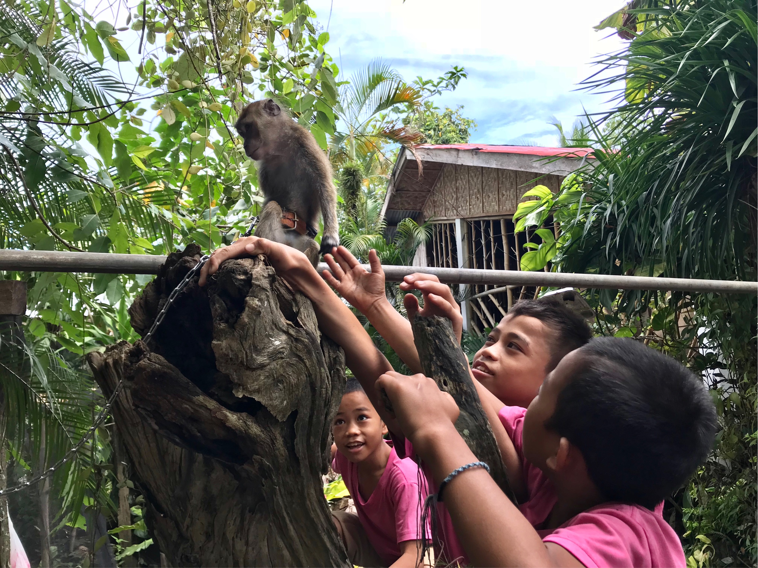 子どもたちが「アテメグミー!来て!猿がいるよ!」と呼んできました。えっ、猿!?野生?危なくない?と思いながら、急いで見に行ってみると、、、向かいの市長さん家が猿を飼い始めた、ということでした(笑)