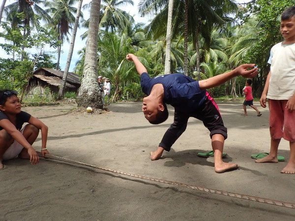 今日はこんな遊びも流行ってました。フィリピン式のリンボーダンスみたいな遊びです。