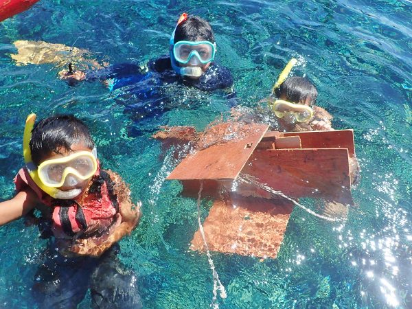 ジャンレが作った廃材の「船」が本当に浮きとして機能して大喜びです。