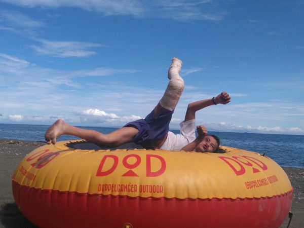 トランポリンの上でなら足をかばいながら転げまわって遊べることに気づきました。