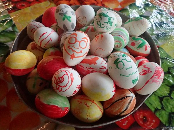 前日にみんなで卵に絵を描いて、オリジナリティーあふれたイースターエッグを作ります。