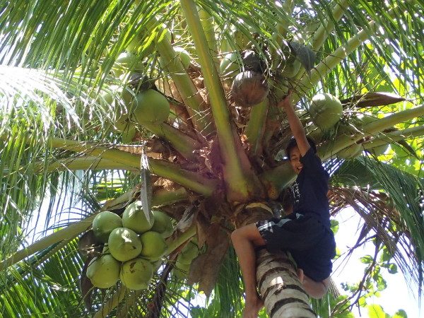 観察し終わったらいつも通り、焼いて食べます。今日はジュンジュンがヤシも採ってくれたので
