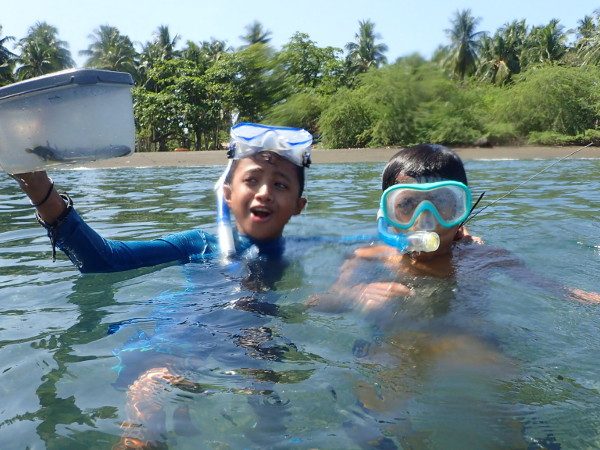 男の子たちは自作のモリでカニや魚、タコなどを獲るのに夢中なんです。