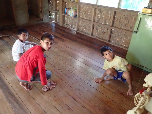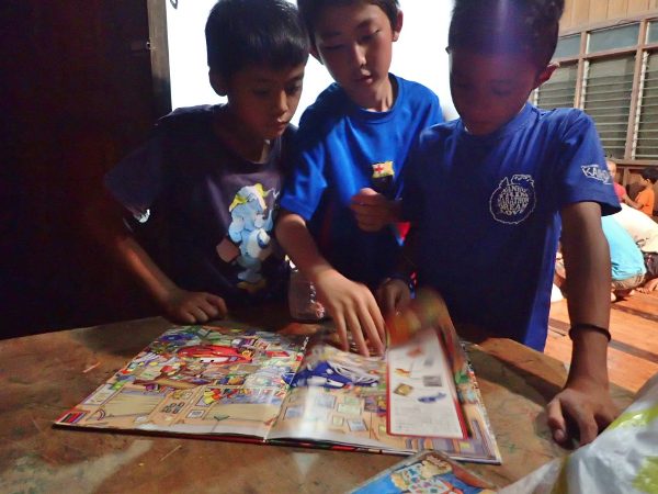 日本から持ってきてくれた迷路やパズルつきの絵本に興味津々なジェイエムたち。