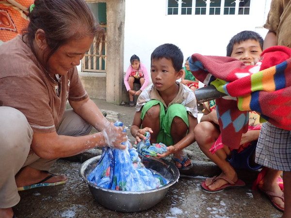 こちらではアイダさんが主導して、各自ブランケットを洗っています。