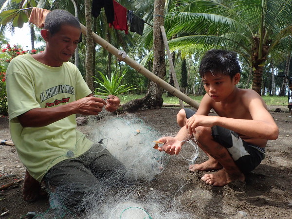 それぞれの趣味に合った遊びが繰り広げられる中、リッキーBは真剣に漁師さんの網のメンテナンスを手伝っていました。