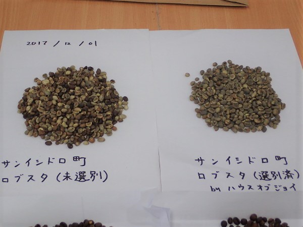 黒い豆、白すぎる豆、まだらな豆、形が欠けた豆などを取り除き、色とツヤと形がいいのを選んだのが右側です。