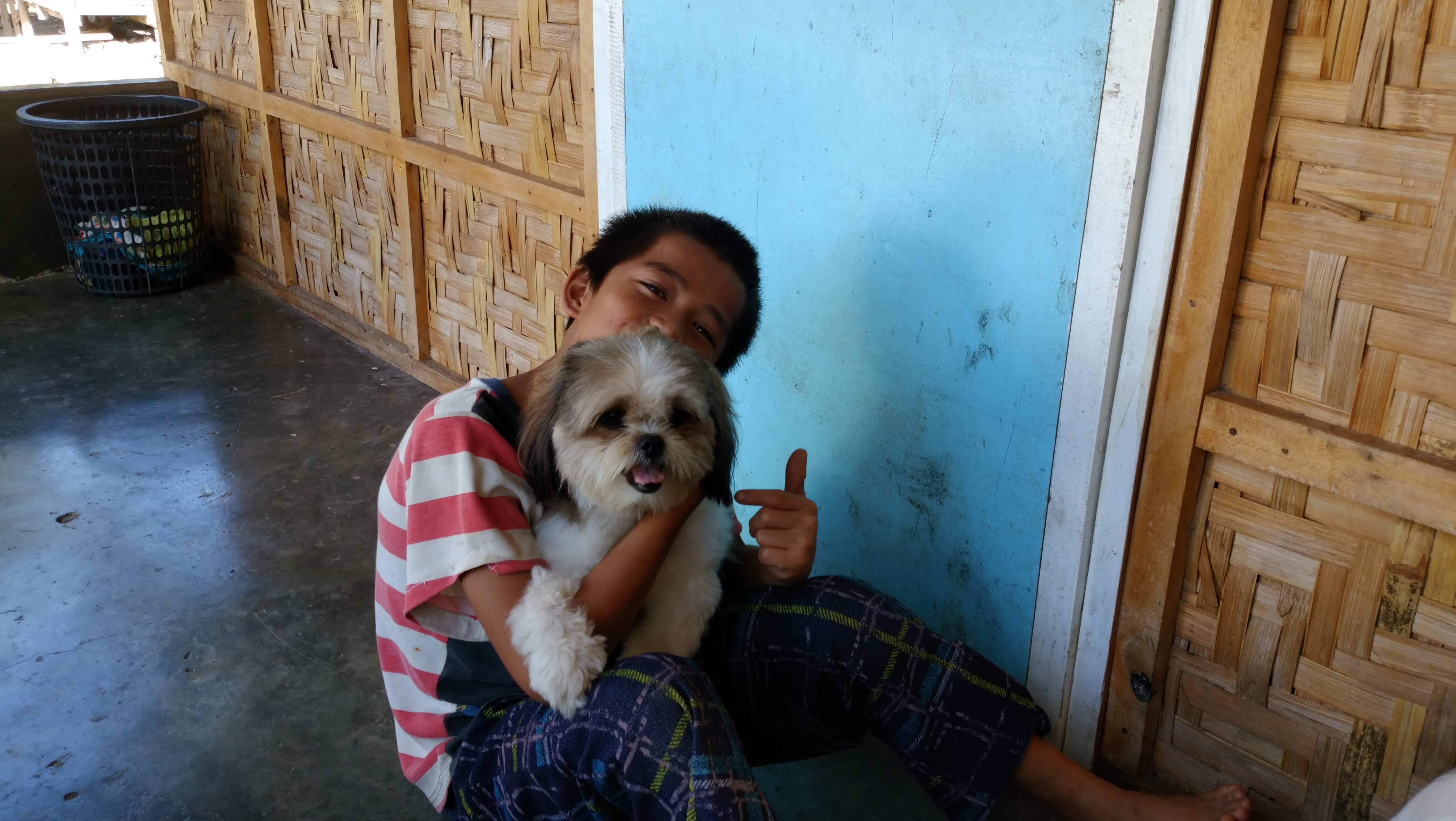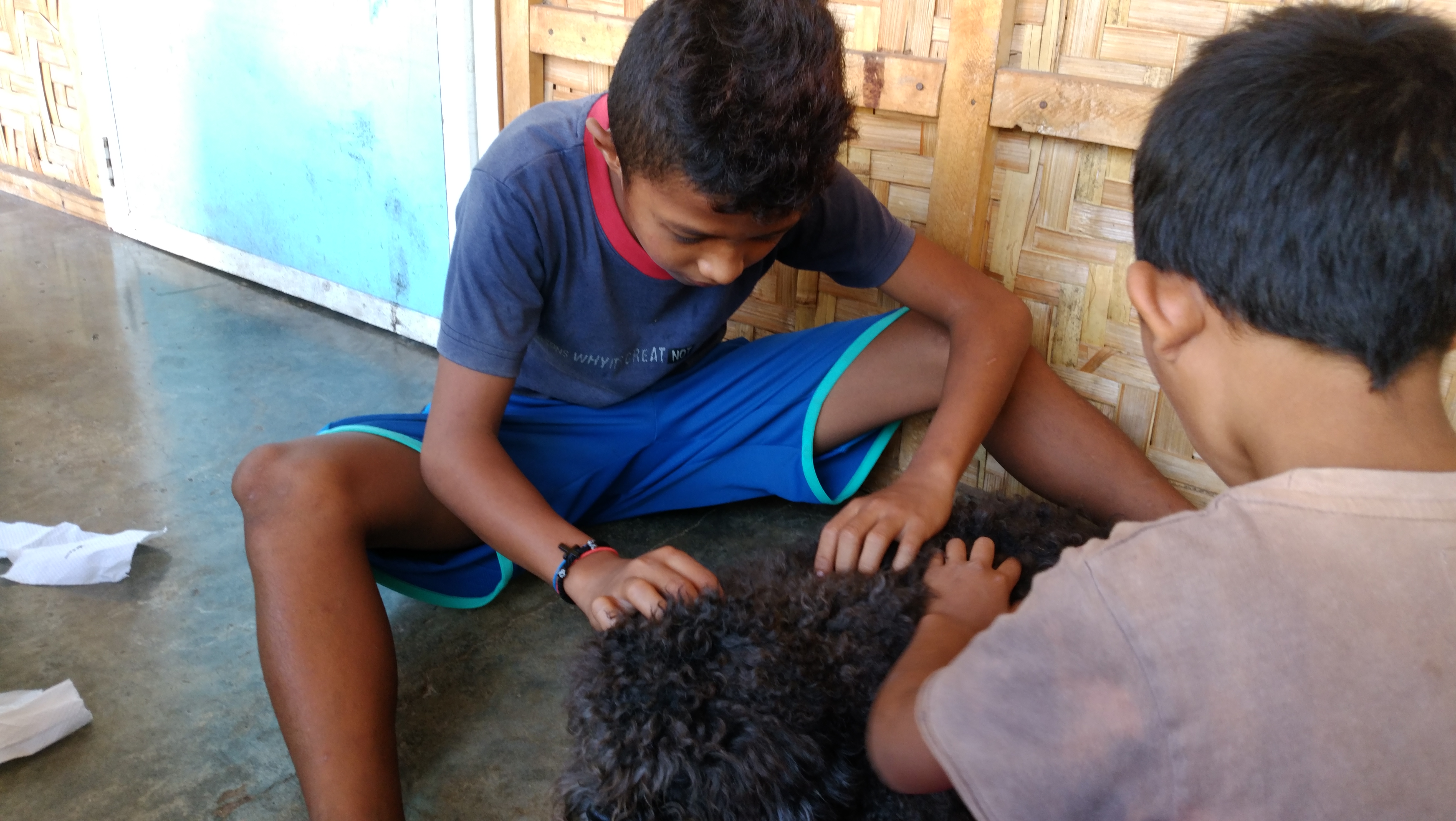 お墓参りから帰ってきてからは烏山さんが飼っている犬の毛だまや汚れを子供達が取っていました。 真剣な表情で取り組むジェイエム! 犬好きなジェイエムは丁寧にトリミングをしていました。