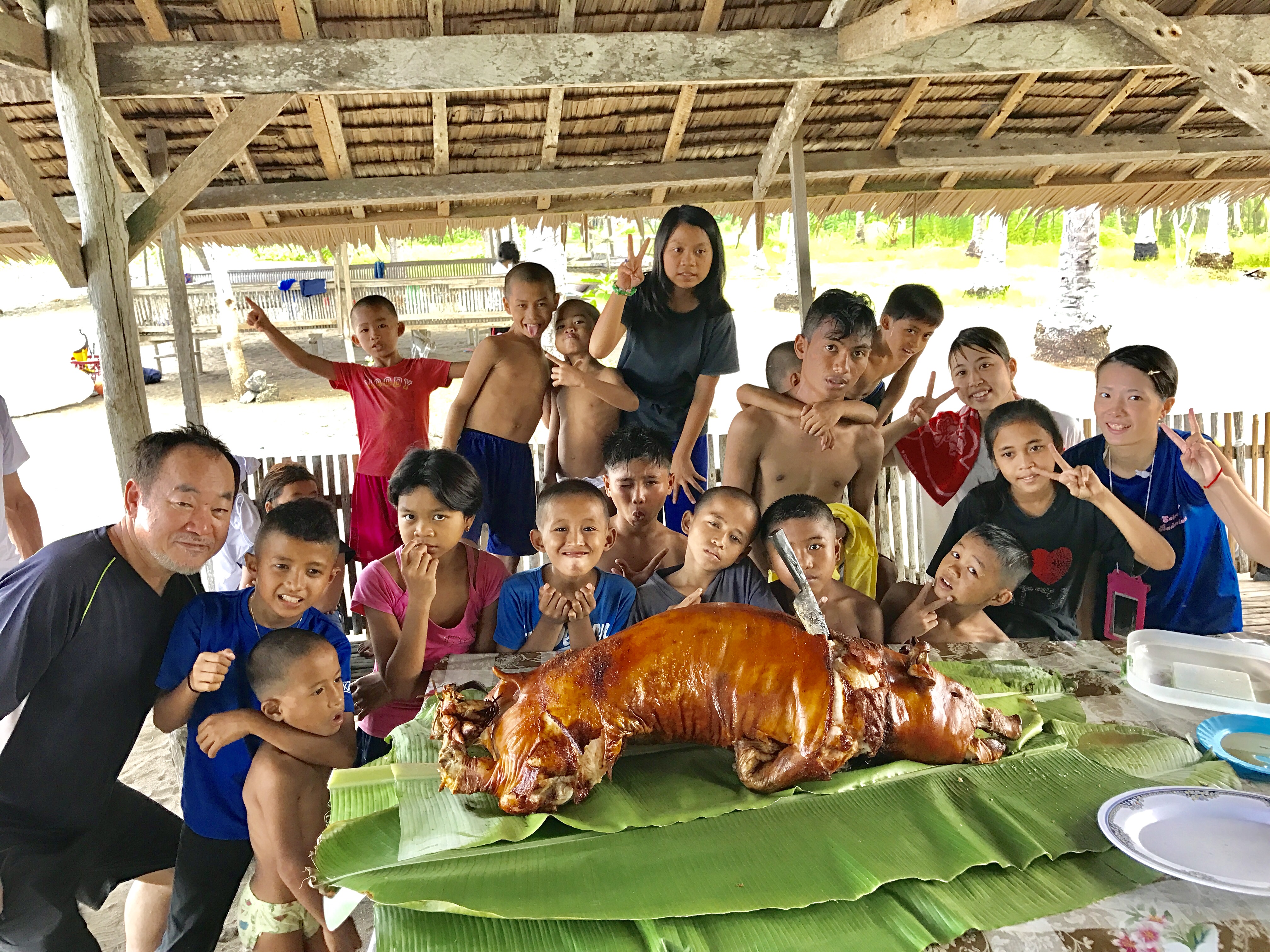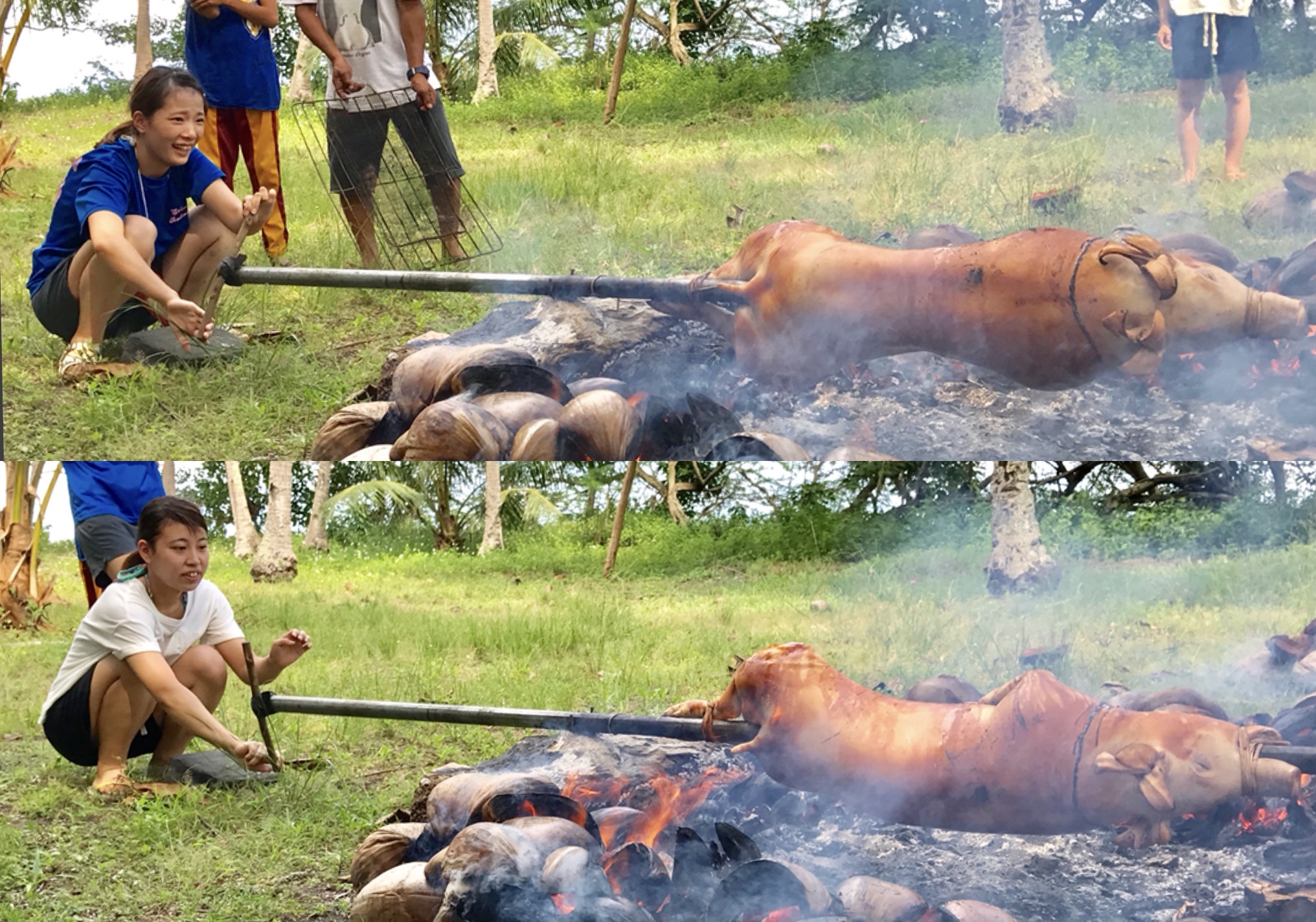 熱い煙の中自分たちで手伝った豚の丸焼きは格別ですし、子どもたちも久しぶりのごちそうに大喜びでした。