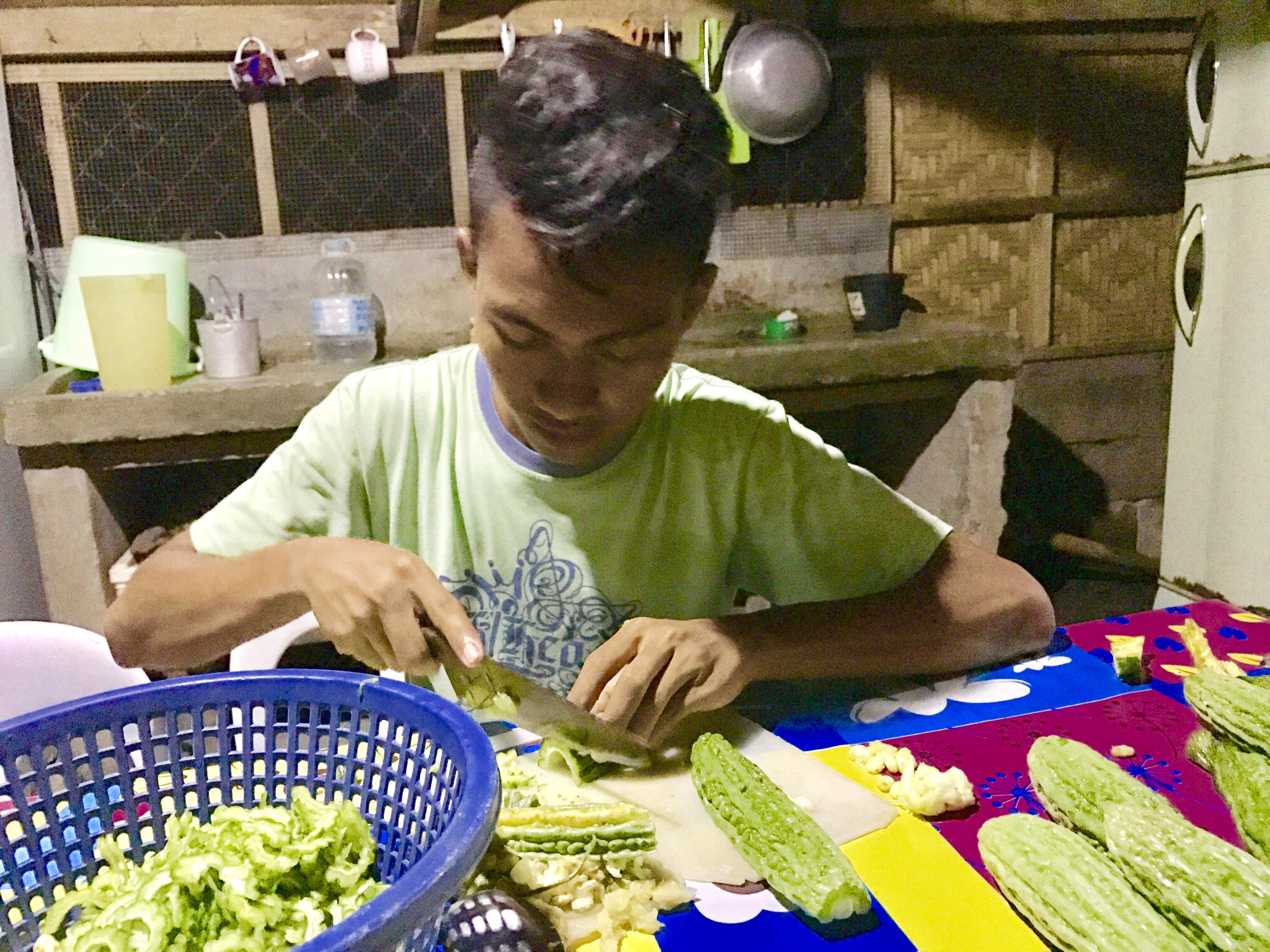 ジェプリルはキッチンで1人明日の朝ごはんの仕込みで、ゴーヤをひたすら切っていました。