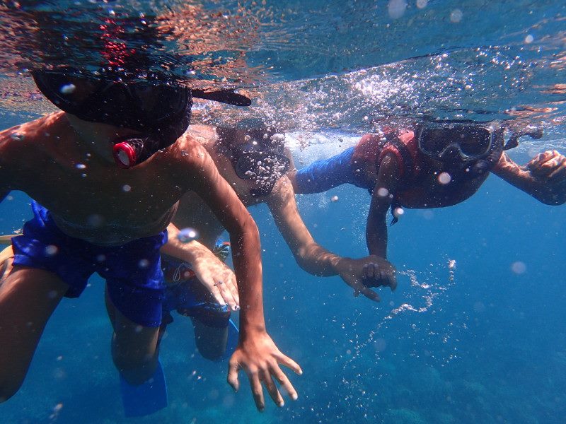 このきれいな海で泳げるだけでもすんごく贅沢なことなのに、きれいな魚や、魚の群れ、珍しい魚を見るたび、手を握り合って「魚!!」「すげええ!!」「うおおおう!!」と子どもたちと景色を共有して楽しめる贅沢を感じて、幸せいっぱいで泳いでました。笑